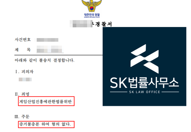 경찰은 변호인의 주장을 받아들여, 의뢰인의 행위가 단 1회에 그쳤고 수익이 매우 적어 '업'으로 대리게임을 했다고 보기 어렵다고 판단했습니다. 이에 따라 객관적 구성요건 해당성이 없으므로 불송치(증거불충분) 결정을 내렸습니다.