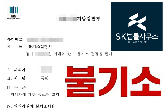 검찰은 피해자가 처벌을 원하지 않는다는 의사를 존중하고, 변호인이 제출한 합의서 및 법리적 주장을 받아들여 의뢰인의 폭행 혐의에 대해 공소권없음 불기소 처분을 내렸습니다.