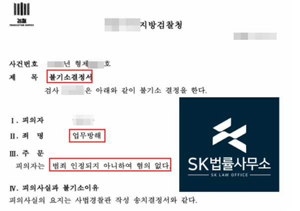 검찰은 본 변호인의 주장을 받아들여 업무방해 혐의에 대해 불기소(혐의없음) 결정하였습니다.