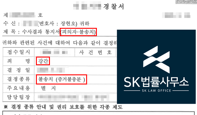 경찰은 본 변호인의 주장을 받아들여, 피해자 진술의 신빙성이 부족하고 강압적인 성관계였다고 보기 어렵다고 판단하여 강간 혐의에 대하여 불송치(혐의없음) 결정하였습니다.