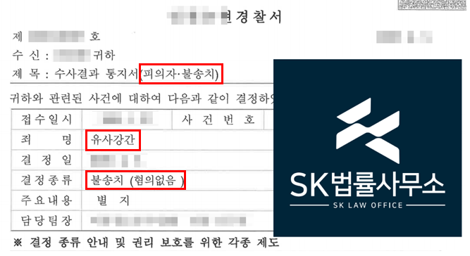 경찰은 본 변호인의 주장을 받아들여, 고소인의 행동이 강제적인 성관계를 당한 피해자의 모습으로 보기 어렵고 피고소인의 일방적인 연락 두절에 앙심을 품고 무고하였을 가능성이 있다고 판단하여, 유사강간 혐의에 대하여 불송치(혐의없음) 결정하였습니다.