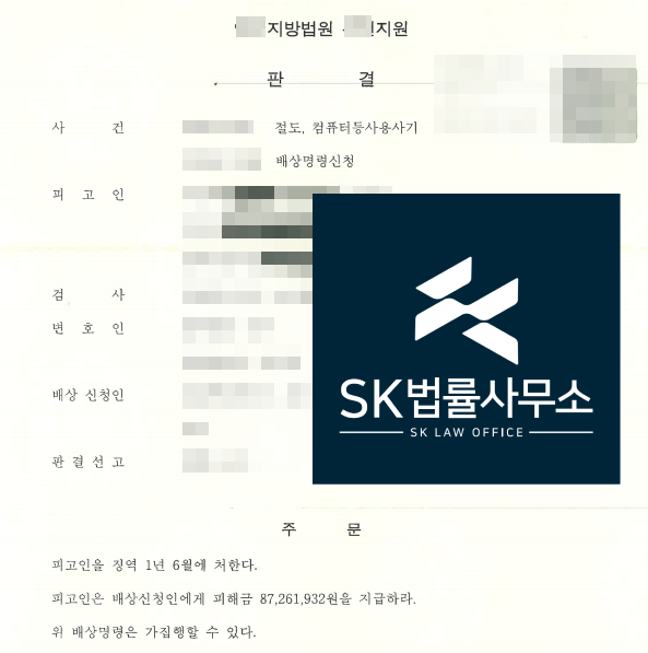 검찰은 피고소인에 대해 구속영장을 청구하였고, 법원은 이를 인용하여 피고소인은 구속 상태에서 재판을 받게 되었습니다 이후 징역 1년 6월의 실형이 선고되었으며, 피해금 87,261,932원에 대해 배상명령을 받았습니다.