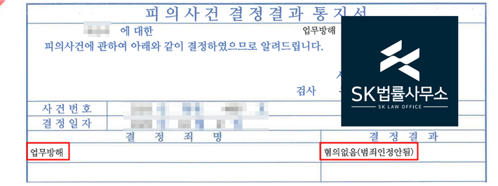 검찰은 본 변호인의 주장을 받아들여 업무방해 혐의에 대해 불기소 결정하였습니다.