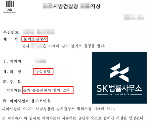 검찰은 본 변호인의 주장을 받아들여, 의뢰인이 술에 취해 텐트를 오인하여 실수로 들어간 것으로 보아 주거침입의 고의를 인정하기 어렵다고 판단, 불기소(증거불충분) 처분을 결정하였습니다.